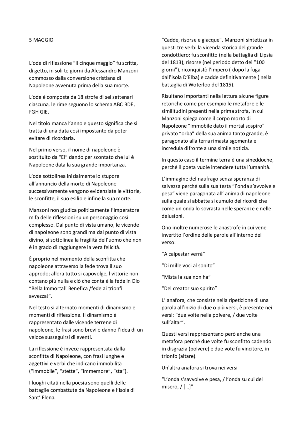 Il cinque maggio è un'ode scritta di getto da Manzoni appena avuta la notizia della morte di Napoleone Bonaparte nel 1821. La poesia circolò clandestinamente a causa della censura austriaca e fu pubblicata ufficialmente nel 1823. Nell'analisi del testo di Il cinque maggio presentata di seguito, oltre a sviluppare la parafrasi e riconoscere le figure retoriche, all'interno del commento.. Il 5 maggio di Manzoni: testo e parafrasi. Commento e spiegazione alla poesia Il 5 maggio: testo, parafrasi, commento, figure retoriche della poesia di Alessandro Manzoni per Napoleone Bonaparte.